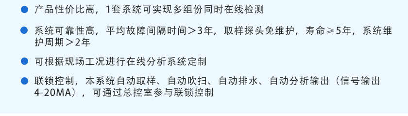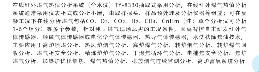 TY-8300型煤氣在線分析系統(tǒng)是天禹智控自主研發(fā)新型在線監(jiān)測系統(tǒng),該產(chǎn)品基于非分光紅外(NDIR)氣體分析技術(shù)、長壽命電化學傳感技術(shù)以及基于MEMS的熱導(dǎo)技術(shù),可同時在線測量煤氣的熱值,以及CO、CO2、CH4、H2、O2、CnHm等氣體的體積濃度。預(yù)處理系統(tǒng)采用冷干法設(shè)計,關(guān)鍵部件采用原裝進口,可根據(jù)現(xiàn)場不同的工況條件,為客戶定制解決方案,保證分析系統(tǒng)的可靠運行。