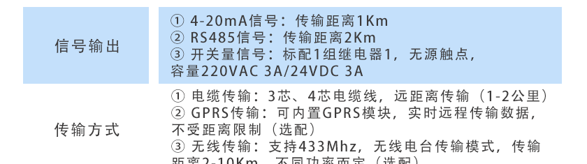 ①電纜傳輸:3芯、4芯電纜線,遠(yuǎn)距離傳輸(1-2公里) ②GPRS傳輸:可內(nèi)置GPRS模塊,實(shí)時(shí)遠(yuǎn)程傳輸數(shù)據(jù),不受距離限制(選配)③無線傳輸:支持433Mhz,無線電臺(tái)傳輸模式,傳輸距離2-10Km,不同功率而定(選配) |