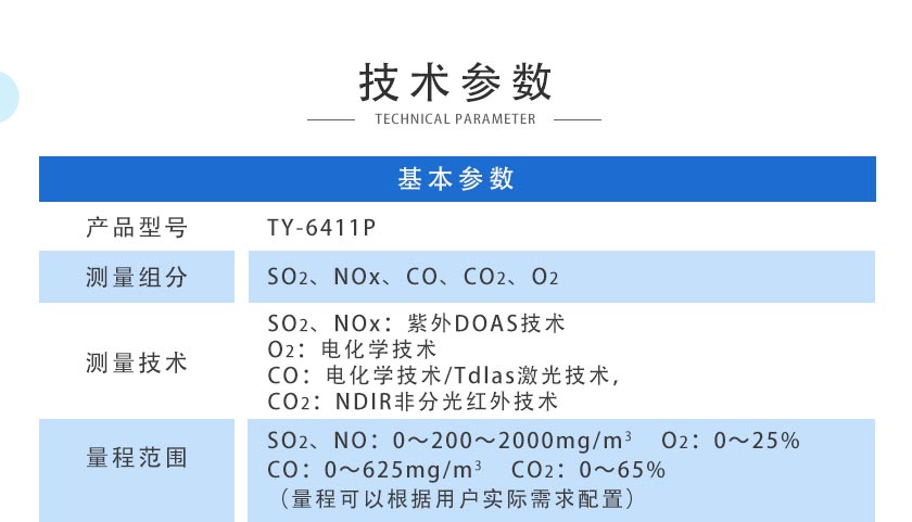 SO2、NOx:紫外DOAS技術(shù);O2:電化學(xué)技術(shù);CO:電化學(xué)技術(shù)/Tdlas激光技術(shù);CO2:NDIR非分光紅外技術(shù) |