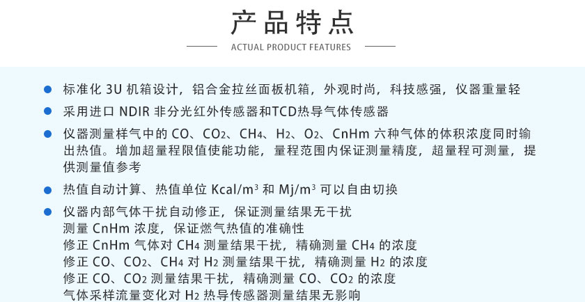 采用自主知識產(chǎn)權的NDIR非分光紅外技術,主要用于測量氣體中的CO、CO2、CH4、C3H8、SO2、NO等氣體的體積濃度及熱值。全進口傳感器、測量精度高、結構簡單、維護方便,軟件功能強大,可拓展性強、現(xiàn)場實用性好,目前暢銷國內外。