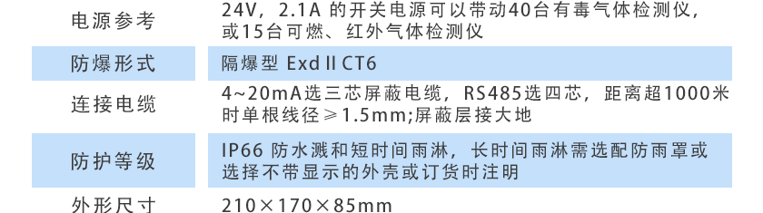 24V,2.1A 的開關電源可以帶動40臺有毒氣體檢測儀,或15臺可燃、紅外氣體檢測儀 |