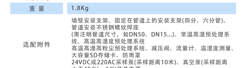 墻壁安裝支架、固定在管道上的安裝支架(四分、六分管)、管道安裝不銹鋼螺紋焊座 (需注明管道尺寸,如DN50、DN15...)、常溫高濕預處理系統(tǒng)、高溫高濕度預處理系統(tǒng)、 高溫高濕高粉塵預處理系統(tǒng)、減壓閥、流量計、溫濕度測量、大容量SD存儲卡、防雨罩、 24VDC或220AC采樣泵(采樣距離10米)、真空泵(采樣距離大于40米)、24V開關電源 |