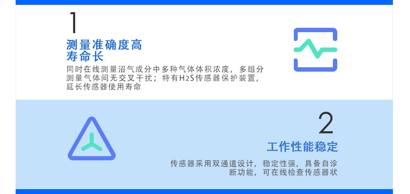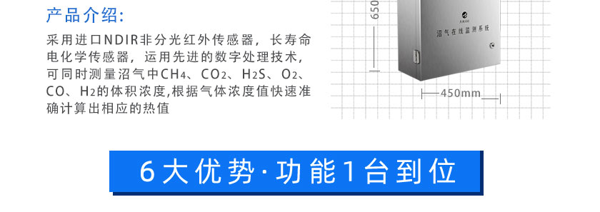 采用進(jìn)口NDIR非分光紅外傳感器,長壽命電化學(xué)傳感器,運(yùn)用先進(jìn)的數(shù)字處理技術(shù),可同時(shí)測(cè)量沼氣中CH4、CO2、H2S、O2、CO、H2的體積濃度,根據(jù)氣體濃度值快速準(zhǔn)確計(jì)算出相應(yīng)的熱值。