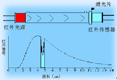 由于各種物質(zhì)分子內(nèi)部結(jié)構(gòu)的不同,就決定了它們對不同波長光線的選擇吸收,即物質(zhì)只能吸收一定波長的光。物質(zhì)對一定波長光的吸收關系服從朗伯—比爾(Lambert2Beer)吸收定律。下圖為NDIR紅外氣體分析原理圖:以CO2分析為例,紅外光源發(fā)射出1~20μm的紅外光,通過一定長度的氣室吸后,經(jīng)過一個4.26μm波長的窄帶濾光片后,由紅外傳感器監(jiān)測透過4.26μm波長紅外光的強度,以此表示CO2氣體的濃度。