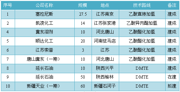 煤經合成氣制乙醇項目在國內發(fā)展較快,目前已經建成產能94.5萬噸,在建和擬建產能達110萬噸,總產能達204.5萬噸。
