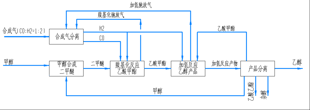 其中DME可來源于合成氣直接合成,也可經甲醇脫水得到,分離雜質后,二甲醚汽化與CO混合進入羰基化反應器,生成乙酸甲酯(MAC),分離雜質后乙酸甲酯與氫氣在加氫反應器中生成乙醇和甲醇,經分離后乙醇作為產品,甲醇返回二甲醚合成單元作為原料又可循環(huán)利用。