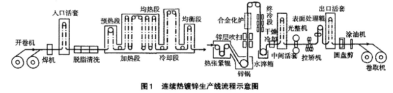開卷→焊接→脫脂清洗→退火爐→(預熱→加熱→均熱→冷卻→均衡)→熱浸鍍鋅→(合金化爐)→鍍后冷卻→光整→拉矯→表面處理(鈍化/耐指紋)→切邊→在線質(zhì)量檢測→涂油→卷取。其流程示意圖如圖1所示。
