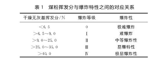 (1)煤粉的揮發(fā)分。一般來講,揮發(fā)分越高、發(fā)熱量越高、活性越高、活化能越低,越容易爆炸。揮發(fā)分Vdaf<6.5%,煤粉幾乎不爆炸,Vdaf>25%時(shí)煤粉就容易發(fā)生自燃,爆炸的危險(xiǎn)性增強(qiáng)。煤粉的揮發(fā)性和爆炸特性之間的對應(yīng)關(guān)系見表1。