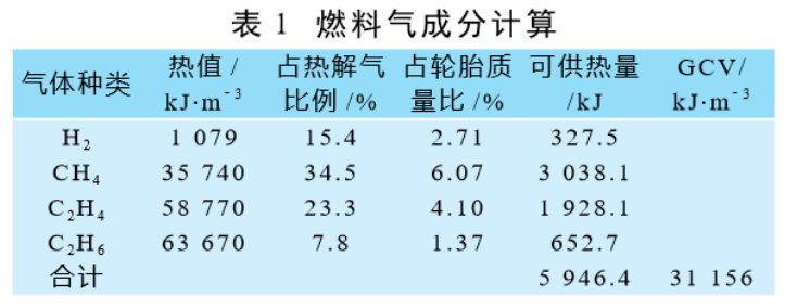 工藝條件不同、廢舊輪胎的差異及計算方式的誤差都可能導(dǎo)致得出裂解氣的GCV不盡相同。在550℃時的熱解氣熱值進行計算,氣體量產(chǎn)占輪胎質(zhì)量百分比17.6%,僅計算熱解氣的主要成分H2、CH4、C2H4、C2H6,計算結(jié)果如表1所示。