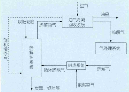 目前處理廢舊輪胎的方法有原型改制、生產(chǎn)再生膠和膠粉、焚燒以及熱解等, 其中熱解技術(shù)一種很具潛力的處理廢舊輪胎的方法。廢舊輪胎熱解技術(shù)是將廢舊輪胎在缺氧或惰性氣體中進行熱分解, 可產(chǎn)生熱解氣、熱解油和炭殘渣等。這些產(chǎn)品經(jīng)進一步加工處理可轉(zhuǎn)化成具有各種用途的高價值產(chǎn)品。與傳統(tǒng)處理方法相比, 熱解法不僅可以回收高附加值的產(chǎn)物, 而且可以回收近 70%的能源, 具有較高的經(jīng)濟和環(huán)境效益。