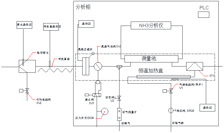 如系統(tǒng)流程圖所示,樣氣經(jīng)采樣探頭,由采樣伴熱管輸送至預(yù)處理單元,預(yù)處理單元包括常閉型高溫閥SV1,精密過(guò)濾器、射流泵,其中SV1閥用于在停止采樣時(shí)切斷氣路,精密過(guò)濾器用于進(jìn)一步凈化樣氣,去除樣氣中的粉塵等,射流泵則用于提供樣氣傳輸時(shí)的動(dòng)力,系統(tǒng)由PLC控制實(shí)際自動(dòng)周期采樣及吹掃。所有樣氣流經(jīng)元件及管路均置于恒溫加熱盒中,防止管路被銨鹽堵塞,減少樣氣損失。