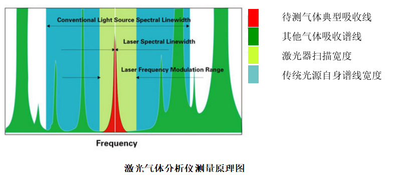 2.4.2 優(yōu)點(diǎn)可調(diào)諧半導(dǎo)體激光光譜吸收技術(shù)TDLAS本質(zhì)上是一種光譜吸收技術(shù),通過(guò)分析激光被氣體分子的選擇性吸收來(lái)獲得氣體的濃度。它與傳統(tǒng)紅外光譜吸收技術(shù)的不同之處在于,半導(dǎo)體激光光譜寬度遠(yuǎn)小于氣體吸收譜線(xiàn)的展寬,如上圖。因此,半導(dǎo)體激光吸收光譜技術(shù)是一種高分辨率的光譜吸收技術(shù)。系統(tǒng)采用特定波長(zhǎng)的激光束穿過(guò)被測(cè)氣體,激光強(qiáng)度的衰減與氣體的濃度滿(mǎn)足朗伯.比爾定理,因此可以通過(guò)檢測(cè)激光強(qiáng)度的衰減信息分析獲得被測(cè)氣體的濃度。采用半導(dǎo)體激光吸收光譜技術(shù)的激光氣體分析儀可從原理上抗背景氣體的干擾,測(cè)量結(jié)果可靠性高。