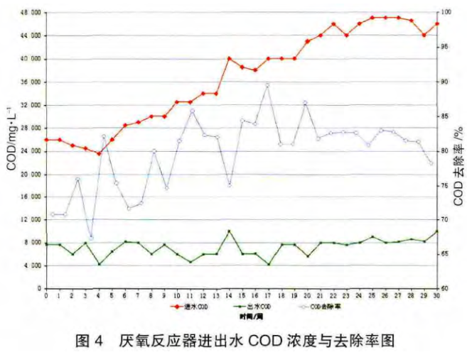 從圖4可以看出,在25?27周,厭氧反應(yīng)器進水COD值最高為46000mg/L左右,出水C0D在8000?9000mg/L內(nèi)波動,COD去除率為80.4% ~82.6%。厭氧反應(yīng)器出水中VFA濃度為2000~3000mg/L,較高的VFA有助于后續(xù)的好氧生物處理。