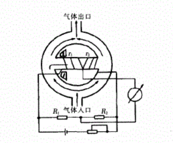 在一個中間有通道的環(huán)形氣室內,外面均勻繞著電阻絲,電阻絲通入電流后既起到加熱的作用,同時又是測量溫度變化的感溫元件。電阻絲從中間一分為二,作為兩個相鄰的橋臂電阻r1、r2,與固定電阻R1、R2組成測量電橋。在中間通道的左側設置一對小電極,以形成恒定的不均勻的磁場。待測氣體從底部人口進人環(huán)形氣室后,由于受到磁場的吸引而進入水平通道,當它處于磁場強度最大的區(qū)域時,也同時被電阻絲加熱。在加熱區(qū)被測氣體溫度升高,電阻絲溫度降低。被加熱的氣體由于溫度升高,體積磁化率將急劇下降,受磁場的吸引力也就大為減弱。而其后冷態(tài)的順磁性氣體在磁場的作用下繼續(xù)被吸引到磁場強度最大的區(qū)域,這就對先前已受熱的順磁性氣體產生向右方向的推力,使其流動而脫離磁場區(qū)域。如此周而復始,形成"磁風"。當被測氣體的磁化強度(即氧含量)越大,形成的"磁風"越強,帶走電阻絲的熱量就越多,電阻絲的阻值就變化越大,阻值的變化與被測氣體中的氧含量呈正比關系,因此可對被測氣體中的氧含量進行測量。