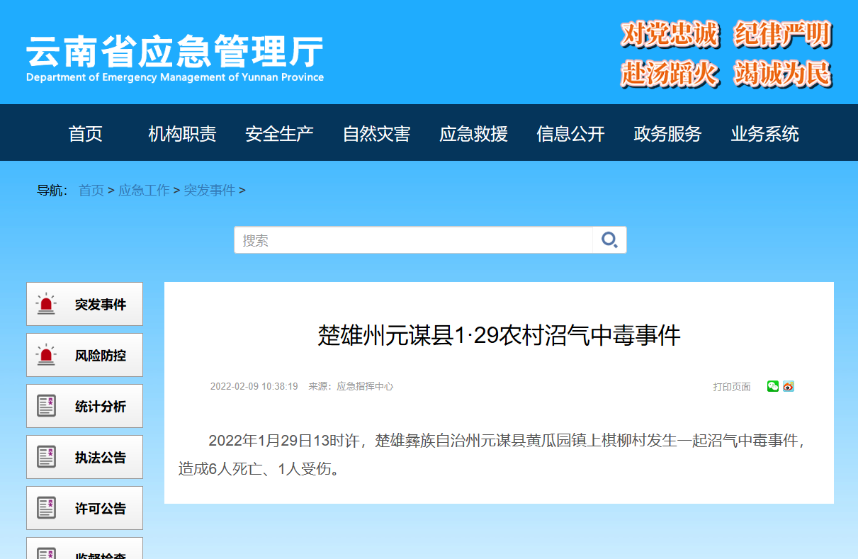 2月9日,云南省應(yīng)急管理廳通報(bào)了“楚雄州元謀縣1·29農(nóng)村沼氣中毒事件”。