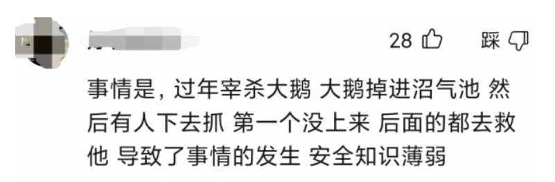 2020年11月15日早晨,四川省樂(lè)山市井研縣馬踏鎮(zhèn)發(fā)生一起農(nóng)村家庭沼氣意外事故,造成4人死亡。經(jīng)調(diào)查,死者周某光在自家窖池腌制豬草發(fā)生沼氣中毒,死者親戚周某安、周某洪、張某巧先后發(fā)現(xiàn)后,下窖池救援,全部沼氣中毒,搶救無(wú)效死亡。
