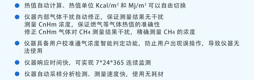 采用進口NDIR非分光紅外傳感器,長壽命電化學(xué)傳感器,運用先進的數(shù)字處理技術(shù),可同時測量沼氣中CH4、CO2、H2S、O2、CO、H2的體積濃度,根據(jù)氣體濃度值快速準(zhǔn)確計算出相應(yīng)的熱值。