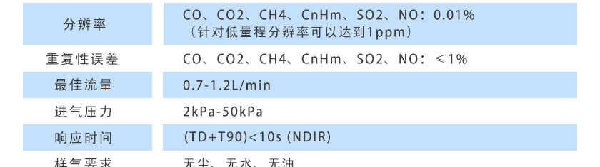 CO、CO2、CH4、C3H8、SO2、NO:0.01%(針對低量程分辨率可以達到1ppm) |