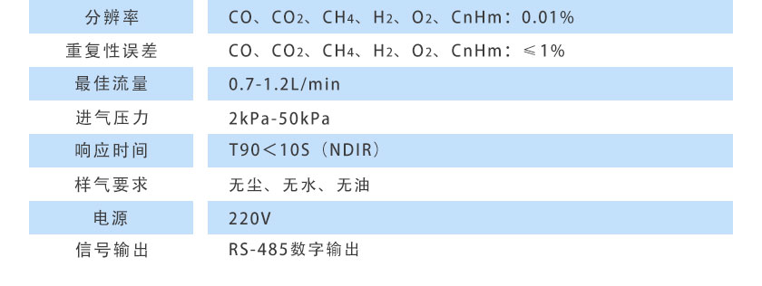 CO:0-75%,CO2:0-25% ,CH4:0-40%,H2:0-75%,O2:0-25%,CnHm:0-5% (量程可根據(jù)用戶實際需求配置) |